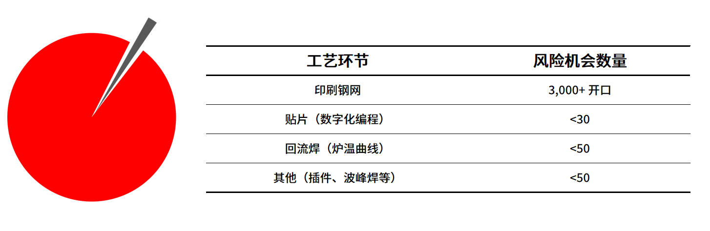 这个对比表直观地展示了问题的严重性。一张钢网可能包含3,000至100,000个开口,每一个开口都是一个潜在的失效点。相比之下,贴片机的数字化编程参数、回流焊的炉温曲线控制点,其风险机会数量仅为钢网开口的数十分之一甚至数百分之一。